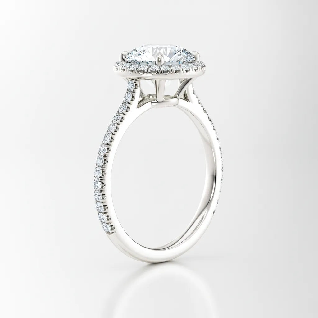 Rosettdesignet – også kjent som halo – gir midtsteinen en forsterket visuell tilstedeværelse og får ringen til å glitre fra alle vinkler. De små diamantene fremhever sentersteinen uten å overta, og gir et uttrykk som er like luksuriøst som det er balansert.